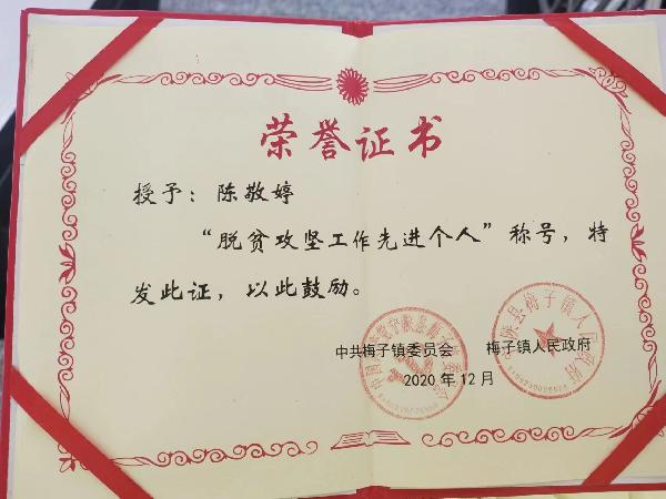 梅子镇脱贫攻坚期间,陈敬婷作为连心干部,按照“五知五晓五帮五新”要求,累计为民办结连心事项100余件。对于有劳动能力的贫困户,她始终坚持开发式帮扶方针,帮他们理思路、定计划、谋长远,带动他们自主脱贫。为发展产业,她深入调研考察,协助村支书在村上发展香椿产业,建起了200多亩香椿产业园,成立了坝源农业开发有限公司,壮大了村集体经济,带动村民共同富裕。党建工作中,她通过健全和完善各项制度等举措建强了基层党组织;宣传工作中,她在安康人大网,陕西法制网,安康日报、民生报累计发表稿件200余篇。