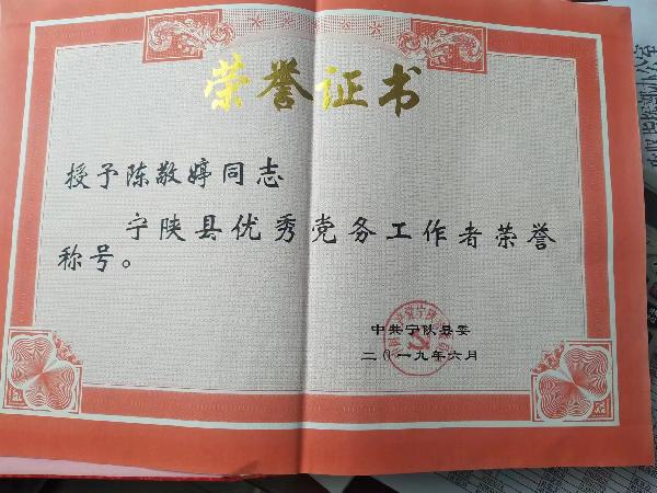 进入基层工作以来,陈敬婷以“党性最强、作风最正、工作出色”为具体要求,从思想上、作风上、能力上加强自身建设,恪尽职守、竭诚奉献、辛勤工作,高质量地完成了各项工作任务。曾荣获宁陕县优秀党务工作者、脱贫攻坚工作先进个人、年度考核优秀等多项表彰。