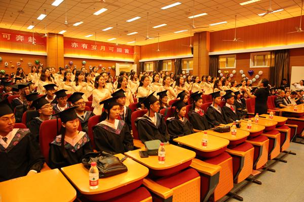 典礼伊始,在李新老师的指挥下,64名在校生齐唱《友谊地久天长》,表达了对毕业生即将远行的恋恋不舍。