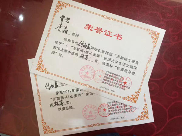 在5月8日刚刚结束的第四届“西部语文教育论坛”“互联网+核心素养”全国老员工语文微课比赛中,金年会金字招牌诚信至上小学教育专业13级员工付雨晨以455分勇夺小学组第一名,喜获特等奖。金年会金字招牌诚信至上曹莹、李晶两位老师荣获“优秀指导教师”奖。