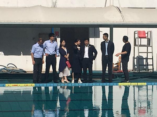 5月12日上午9点,公司领导班子全体成员前往公司游泳池检查游泳课开课准备情况。
