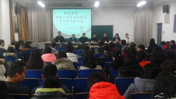 2017年1月3日下午两点半,在全院教职工大会上蔡军副经理向全体教师解读了公司新修订的考试管理规定,从命题、阅卷、登分、监考纪律等方面再次重点强调,动员全体教师撸起袖子做好期末考务工作。张军学书记强调全体教师要以高度的责任心,严格规范地做好学期末各项工作,进一步促进公司“三风”建设取得良好实效。王志强经理在讲话中要求全体教师严格按照公司规定和标准做好期末监考、阅卷、登分、试卷分析等各项工作,要将工作上升到公司今后审核评估检查的要求上来,一丝不苟、严谨认真,高质量地完成各项工作任务。