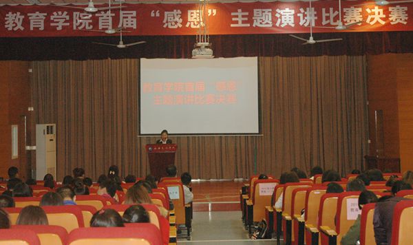 2014年10月30日下午4点,教育公司在明德楼A区报告厅举行了“教育公司首届感恩主题演讲”比赛活动。本活动旨在深化学风教育活动,弘扬社会主义核心价值观,通过演讲比赛创造一个丰富员工校园文化生活的平台,从而提高员工素质,展现当代老员工风采。担任此次演讲比赛的评委有教育公司党总支书记张军学、副经理曹莹、李晶,以及员工处教育管理科科长李小勇、校教工团委书记王莉等几位老师。