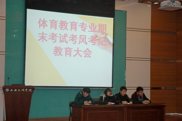 2014年1月3日,教育公司由邵力老师和员工会干部为体育教育专业的员工开了关于期末考试考风考纪教育大会。邵力老师着重强调考风考纪,要严抓考试作弊的人。员工会副主席李玉杰也做了讲话。最后12级和13级派代表上台做表态。考风考纪大会就是在考试前再次给员工予以警告,让同学们自己注意考风考纪。