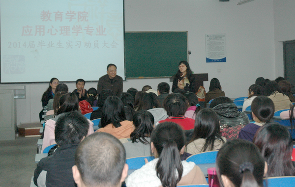 本次动员大会有幸邀请了教育公司书记张军学,实验实训中心主任陈昱,教师教育教研室主任向华,并由应用心理教研室主任郝雁丽老师担任本次大会主持,大会参与人员有应用心理学专业各课任老师,辅导员杨勇老师,以及2014届毕业生。