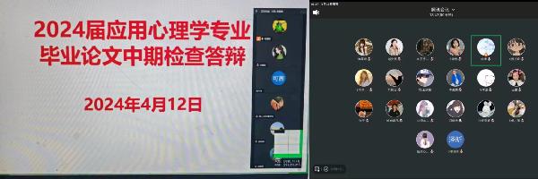 为进一步掌握2020届本科生毕业设计(论文)工作的具体进展情况,确保应用心理学专业员工毕业设计(论文)的完成质量,于2024年4月12日下午19:00-22:00,应用心理学系组织毕业论文指导教师采用腾讯会议,分为四组,在线上对2024届应用心理学专业61名毕业生的论文开展中期检查工作,全体毕业论文指导教师参加了中期检查工作。