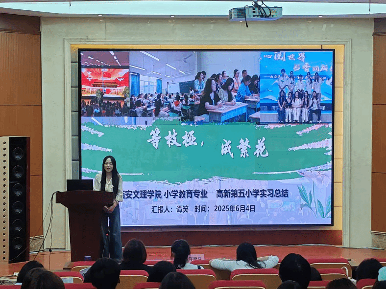 首先,参加本次实习的员工代表进行分享交流。小学教育2202班谭笑分享了她在高新第五小学的实习经历,她表示通过教学方法和理念的学习、参与员工全面发展的培养,以及自我提升,收获良多,为成为一名正式教师打下了坚实基础。2202班陈钰婷以“教育是一场幸福的相遇”为主题分享了她在西安电子科技大学附属小学的实习经历,她用“遇师”“育人”“寓教”“愈己”四个关键词概括了她在实习时期的成长历程。2203班王晓宁分享了她在周至小学的实习经历,从初入知行到躬行实践,再到收获与成长,通过讲述在实习中与员工的互动交心,令同学们感触颇多。