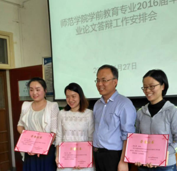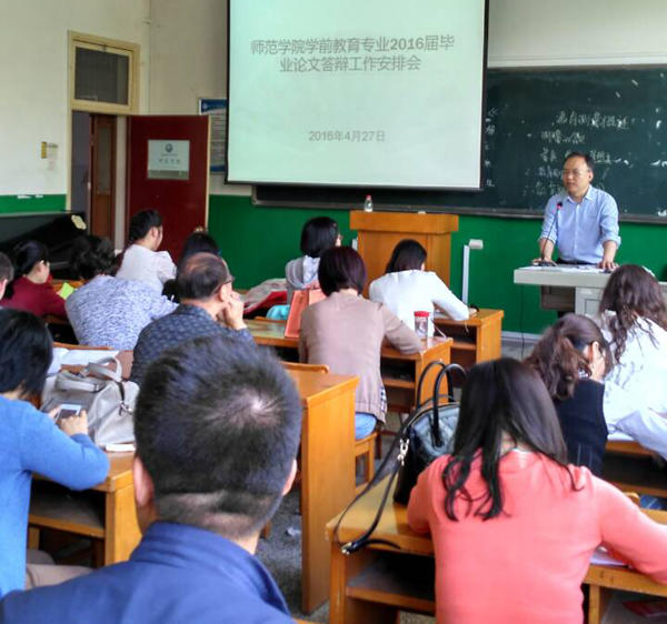 2016年4月27日下午4:00金年会金字招牌诚信至上幼儿师范系在弘文楼H0301隆重召开了2016届学前教育本科毕业生论文答辩工作安排会,公司党委书记张军学,幼儿师范系主任王晓翌、系主任助理赵四鸿、各教研室主任及48位答辩委员,幼儿园外聘骨干教师代表参加会议。系主任王晓翌主持会议,党委书记张军学为幼儿园外聘教师颁发了聘书及优秀教师指导证书,张书记针对答辩的意义和以毕业论文为载体,多方面引导和指导员工如何挖掘自身潜力把论文的理论知识变为社会应用价值高的知识等方面发表了讲话,对在做教师提出了希望和要求,老师们表示一定做好论文的收尾工作,保证答辩顺利进行,完满完成任务。