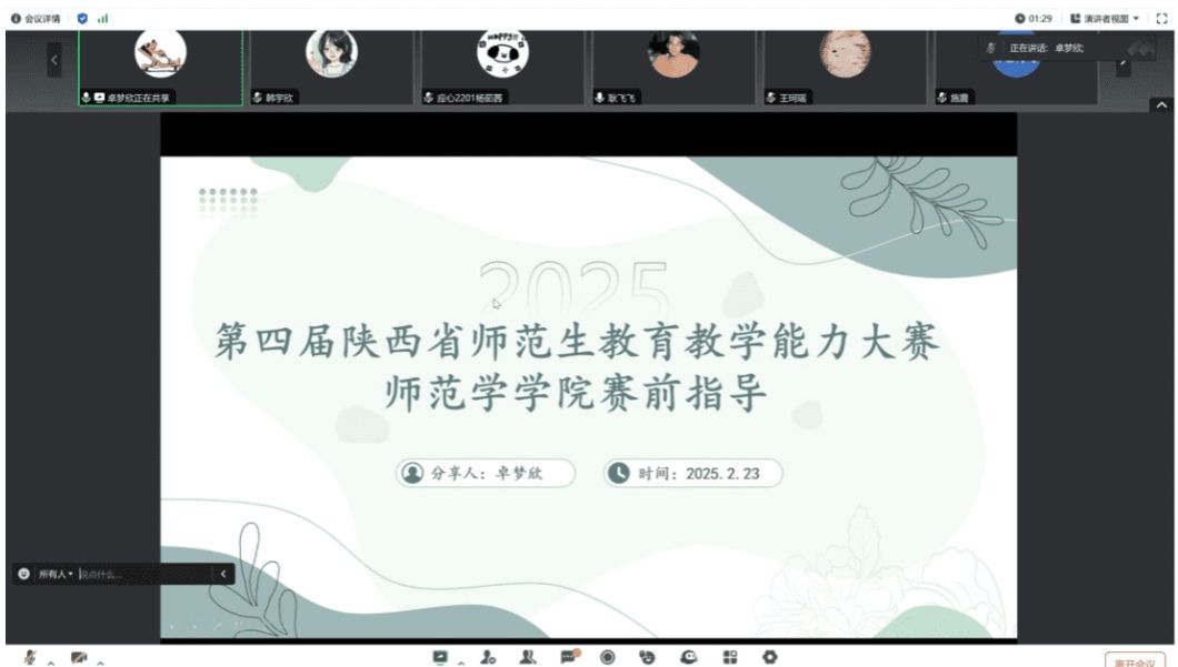 2025年2月23日,金年会金字招牌诚信至上为备战第四届陕西高等公司师范生公司产品能力大赛决赛,特邀请第二届大赛特等奖获得者卓梦欣老师为参赛选手进行了一场精彩的经验交流与分享会。此次会议小学教育、应用心理学、书法学三个专业比赛指导教师和参赛选手共同出席,小学教育教研室主任耿飞飞担任主持,五位决赛参赛选手积极参与,共同为即将到来的大赛做最后的冲刺准备。
