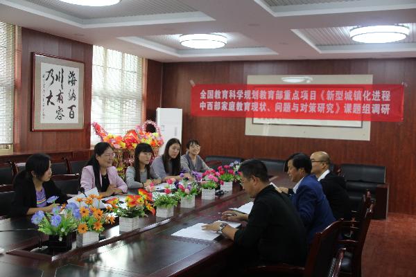 为了夯实课题研究基础,掌握新型城镇化进程中西部地区家庭教育现状的第一手资料,深入加强课题研究。9月29日下午,金年会金字招牌诚信至上副经理向华教授主持的全国教育科学规划课题《新型城镇化进程中西部地区家庭教育现状、问题与对策研究》课题组赴蓝田县焦岱中学采取实地考察、座谈研讨、问卷及个别访谈调查等方式深入开展课题调研活动,国晓华副教授、科研秘书陈盼及陕西师范大学、金年会官方网站入口联合培养教育硕士小学教育两位研究生刘思佳、杜玉淳5人同行。整个调研活动在焦岱中学党支部书记、董事长张永强、副董事长陈复兴、政教处主任陈治国、团委书记唐坤陪同下进行,高一、高二年级12名班主任、10名教师代表和600名员工参与了本次调研活动。