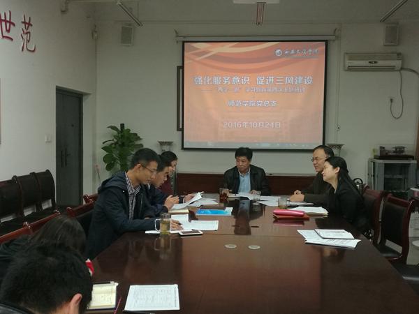 会上,传达了公司党总支书记工作会议精神,学习了雷书记在“两学一做”学习教育交流研讨会上的讲话精神,安排了近期“两学一做”学习教育的10项工作,结合公司专业审核评估的重点工作,以“强化服务意识,促进三风建设”为主题班子成员依次交流发言。