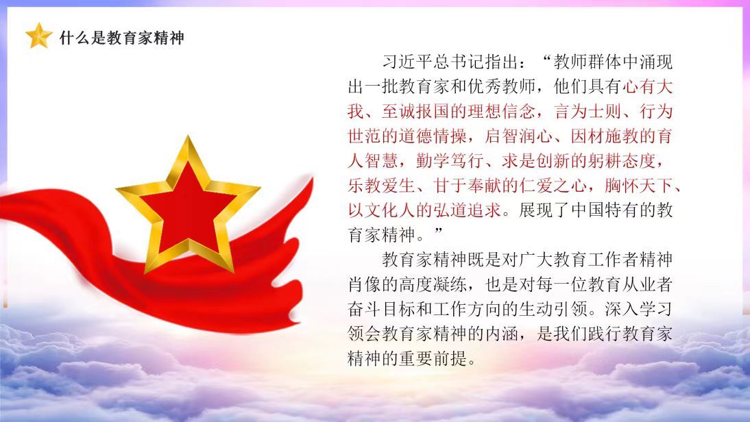 通过今天“教育家精神”党日活动,有人说,长江后浪推前浪。确实,说得没错。但是,没有前浪又哪来的后浪?在生活中、工作中,正是一代代“前浪”亦师亦友,在成功的时候提醒我们,在失败的时候鼓舞我们,帮助我们成长、成功。感谢你们,不低头,谋发展,让我们自由徜徉。我们都很幸运,遇上了和平的繁华盛世,前辈们用血汗所付出的劳动为我们铺就了一条走向成功的康庄大道。在那个与现在截然不同的年代,你们白手起家,下过农田,爬过深山,拿着不高不低的文凭走向县城,只是为了让我们不输在起跑线上。你们默默肩负起了生活的一切,赚钱养家、赡养老人、柴米油盐,正是你们的坚守,造就了这个繁荣发展的时代,让我们得以站在巨人的肩膀上看世界,感谢你们,用自身的实际教会了我们什么是“不服输”的人生,什么是打不垮的人生态度。