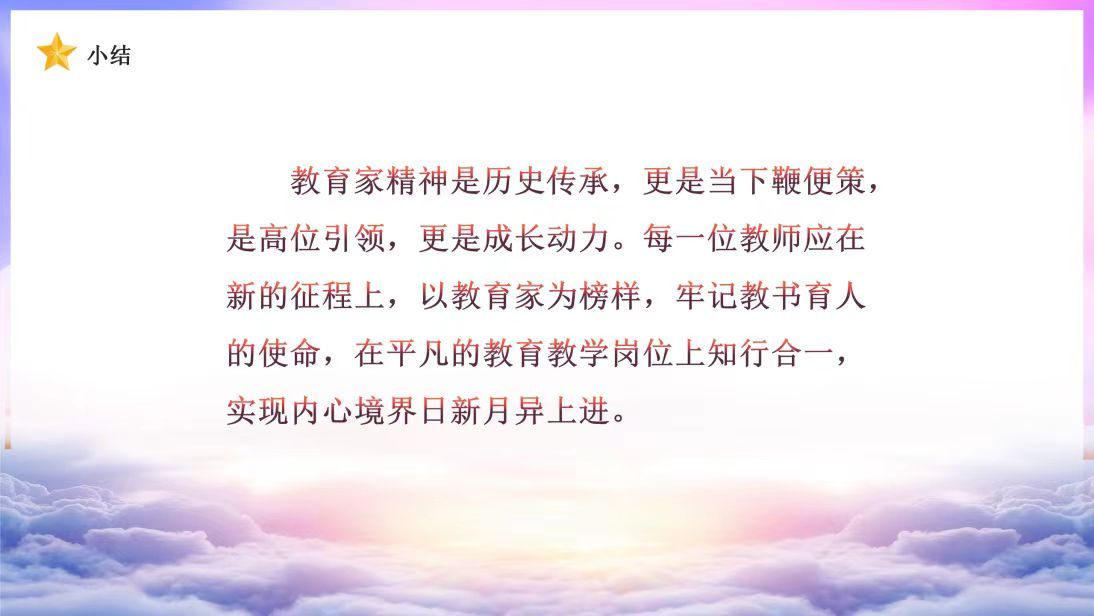 学习教育家的精神是一种深刻的体验,因为他们的思想和理念贯穿于教育的各个领域。首先,教育家的精神强调了教育的重要性,不仅是知识的传授,更是品德的塑造和个人发展的促进。其次,他们倡导个性化教育,认为每个员工都有其独特的天赋和潜能,需要因材施教,激发其内在的动力和兴趣。此外,教育家的精神强调了教育的社会责任,认为教育应当服务于社会的发展和进步,培养具有社会责任感和全球视野的公民。通过学习教育家的精神,我深刻体会到教育的使命和价值,意识到教育不仅是为了个人的成长,更是为了社会的繁荣和进步。同时,我也明白到个性化教育的重要性,要充分尊重员工的差异性,注重个体发展,才能真正实现教育的目标。最后,我将以教育家的精神为指引,不断探索教育的新思路,努力为教育事业贡献自己的力量。