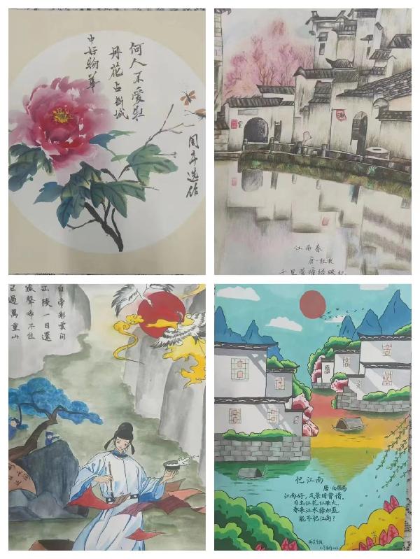 一首首诗词跃然纸上,一幅幅优美的画卷。表达着同学们对诗词的理解,对艺术的追求,对生活的热爱。同学们用画笔解读诗词世界,感受古诗词的无穷魅力。在创作的过程中不断地诵读与体会,将诗词中一个个意象抽离再具体,最后以图画呈现,让古诗词焕发了新的活力,闪烁着想象与创新的光彩。