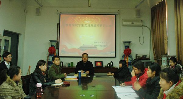 2014年12月23日下午四点在明德楼B0312会议室,教育公司召开“教育公司员工党员发展及转正大会” 出席此次会议的领导及老师有教育公司党总支书记张军学,学工办主任邵力,应用心理学专业辅导员杨勇、王玲老师。参加此次会议的员工是教育公司的全体党员及预备党员。