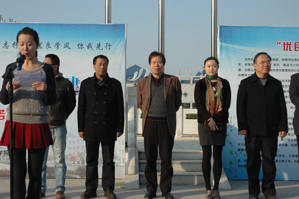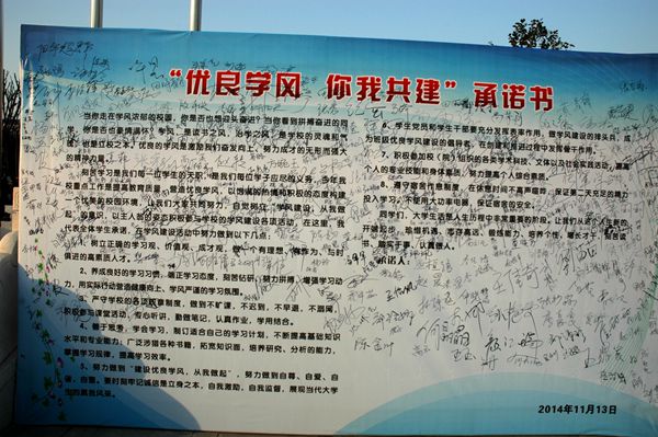 2014年11月13日下午四时,在金年会官方网站入口南门广场举行了由员工工作处(部)主办,教育公司承办的“优良学风,你我共建”的学风建设承诺活动启动仪式。