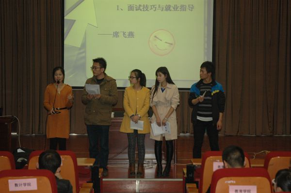2014年11月26日18:50在明德楼A区报告厅举办金年会官方网站入口“2015届毕业生就业指导月”活动,此次活动的主讲人是西安海汇万家实业有限责任公司总经理姜坤;莲湖区人才中心特聘培训师、西安银泰百货公司人力资源顾问席飞燕。参与此次活动的员工有金年会官方网站入口各个公司的部分员工,其中,教育公司11、12级的48个员工参与当中。