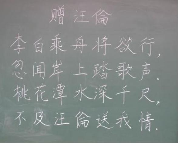 诗歌感悟:“此诗前两句描绘李白乘舟欲行时,汪伦踏歌赶来送行的情景,朴素自然地表达出汪伦对李白那种朴实、真诚的情感;后两句先用“深千尺”赞美桃花潭水的深湛,紧接“不及”两字笔锋一转,用衬托的手法,把无形的情谊化为有形的千尺潭水,生动形象地表达了汪伦对李白那份真挚深厚的友情。全诗语言清新自然,想象丰富奇特,虽仅四句二十八字,却是李诗流传最广的佳作之一。”