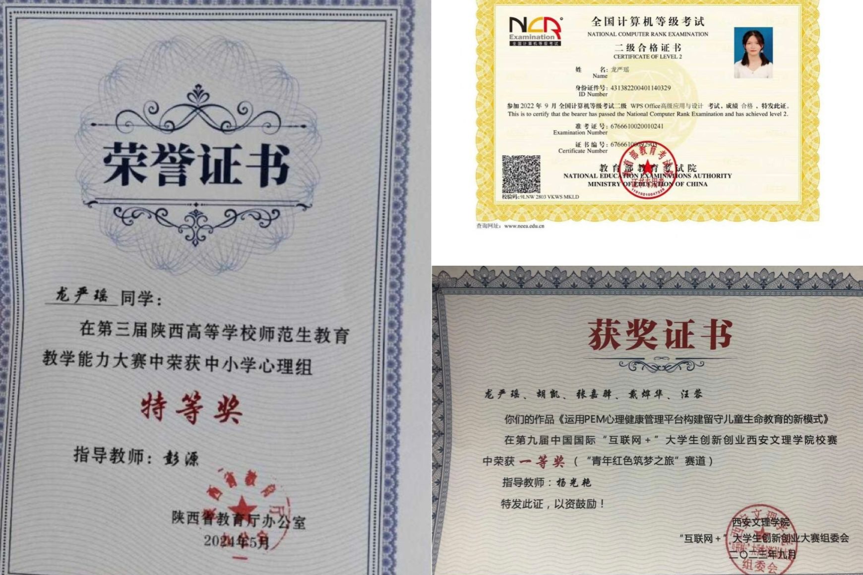 获得国家级奖项2项、省级2项、市级1项、校级若干项,其中包括:2022年老员工创新训练项目国家级立项、国家励志奖学金、第三届陕西高等公司师范生公司产品能力大赛特等奖、中国计算机设计大赛西北赛区获三等奖、共青团娄底市老员工“返家乡”社会实践活动、中国国际“互联网+”老员工创新创业一等奖、金年会官方网站入口春季田径运动会第四名、校级一等奖学金、校级三好员工、校级优秀员工干部、校级优秀团员等。