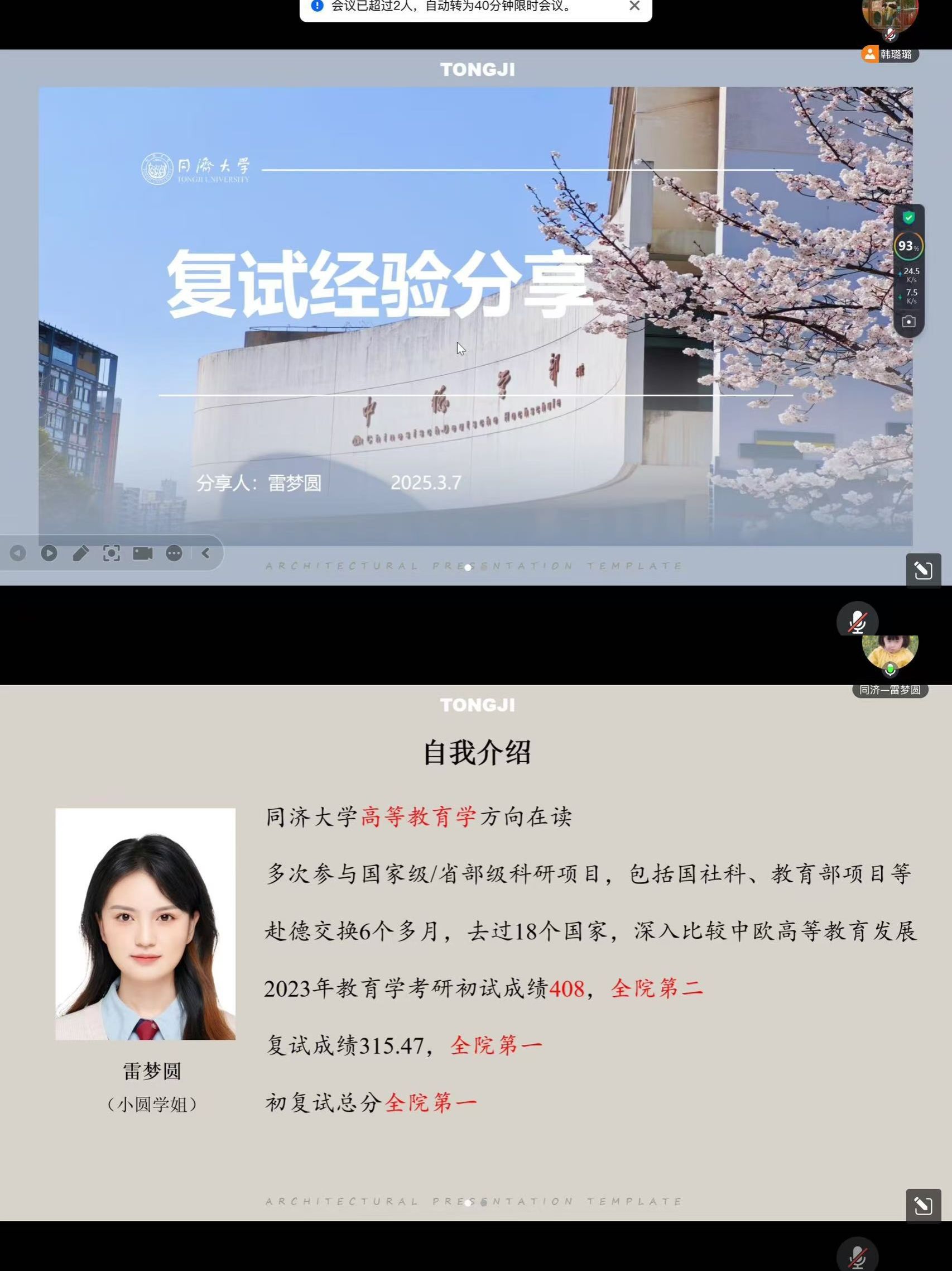 第一位学姐雷梦圆,考入同济大学高等教育学专业,她从复试备考策略和心态调整两方面展开分享。她详细讲解了专业课笔试和面试的准备技巧,特别强调了在自我介绍和简历中巧妙设计问题,引导老师提问自己熟悉的领域。此外,她还提醒同学们保持自信,适度紧张是正常的,关键是要做好充分准备,积极应对挑战。