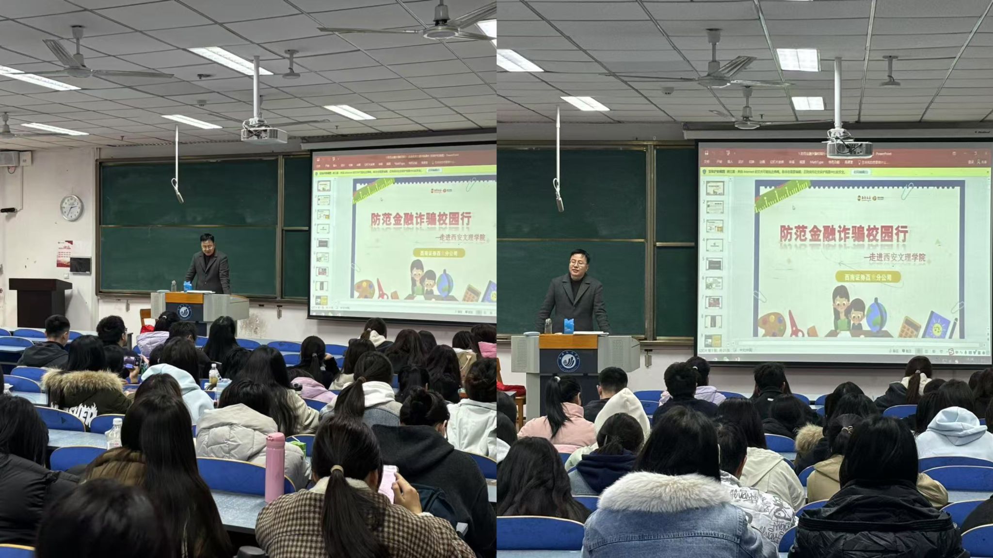 讲座聚焦"专业反诈·智慧防范"主题,靳波结合金融行业实战经验,系统解析了三大类高发诈骗模式:其一,电信诈骗通过技术伪装实施精准打击,不法分子常冒充银行、公检法等权威机构,虚构"账户异常""涉嫌违法"等紧急场景;其二,网络投资陷阱以"高收益、低风险"为诱饵,通过伪造交易数据、虚假盈利报表等心理操控手段,诱使受害人陷入庞氏骗局;其三,熟人社交型诈骗更具隐蔽性,借由"内部消息""稳赚项目"等话术,利用信任关系实施情感绑架式诈骗。