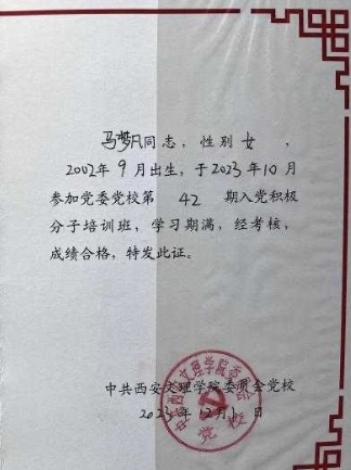 在思想上,以优秀思想为基石,树立了积极向上、乐观豁达的的人生观和道德观,积极向党组织靠拢。在2023下半年成功完成推优,成为了一名入党积极分子,于2024年9月成为发展对象,12月成为一名中共预备党员。我时时刻刻以一名党员的标准严格要求自己,并为社会的发展进步贡献自己的青春力量。