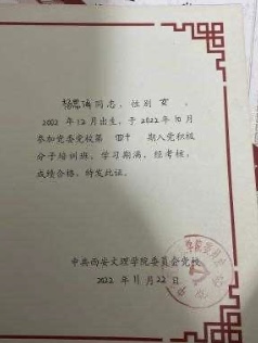 在思想上,积极向党组织靠拢,树立良好的人生理想以及正确的价值观。在2022年成功完成推优,成为了一名入党积极分子。于2023年成为一名中共预备党员,认真学习完成每月的支部主题党日活动。时刻以一名党员的标准严格要求自己,积极参加各种活动,贡献自己的一份力量。