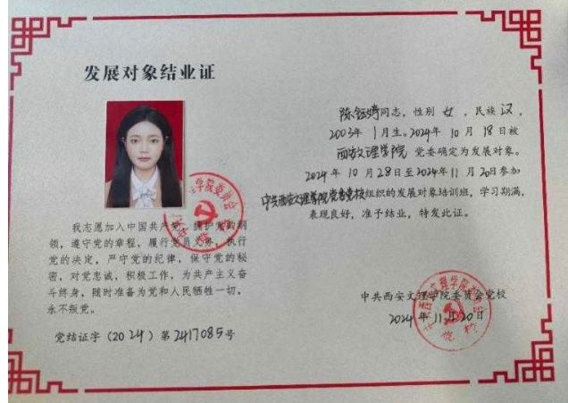 在思想上,我积极向党组织靠近,自觉学习习近平主席新时代新思想。在大一刚开学我就递交了入党申请书,未通过,但我不曾放弃,一直努力学习,在大二学年有幸成为一名入党积极分子,认真接受党课培训,做好笔记,通过了积极分子结业考试。在经过一年的培养和推优,于2024年10月18日确定为发展对象。我也会一直以党员的标准严格要求,为党的事业做出贡献。